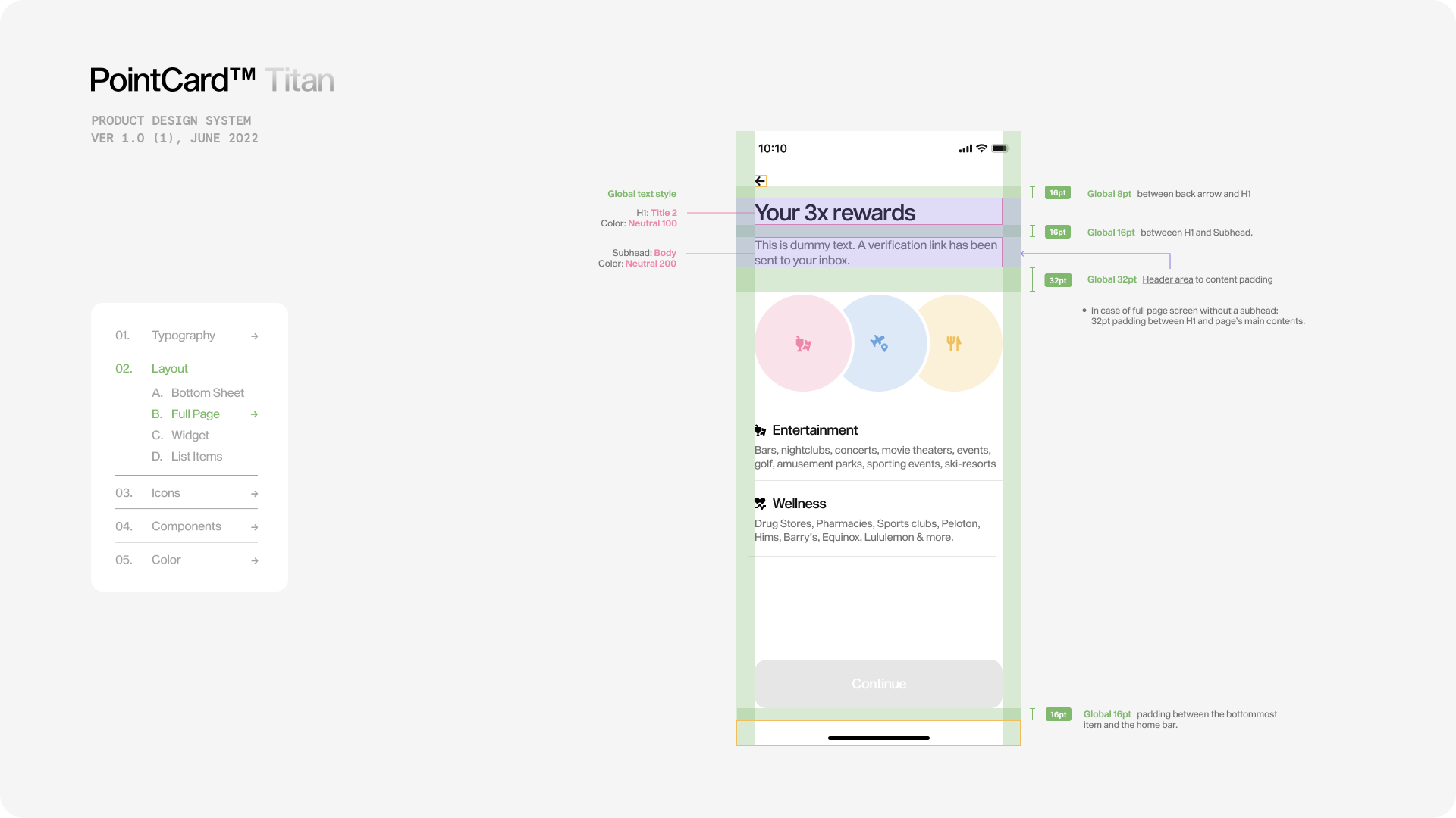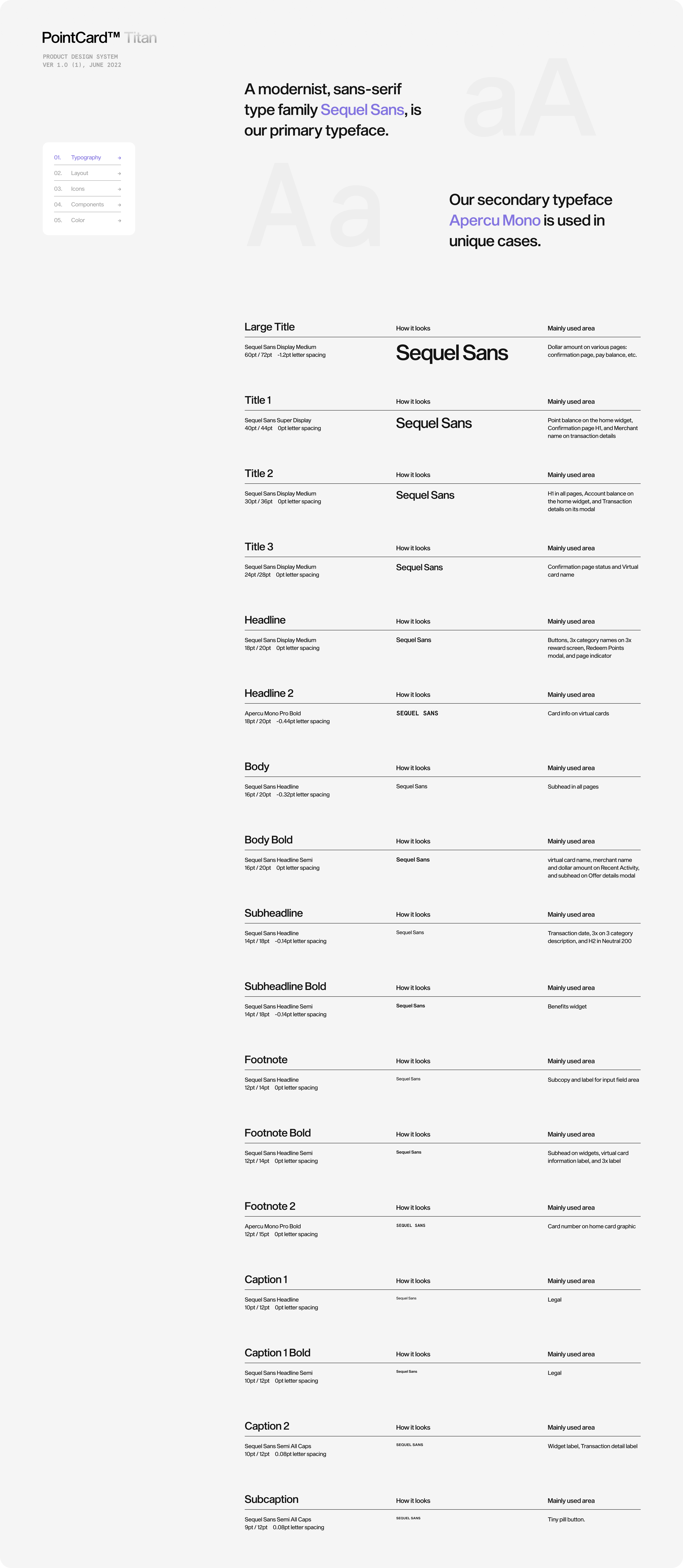 To incorporate Titan app's visual appeal, I aimed to create a cohesive and widget-like style for the presentation deck, essentially transforming it into a "giant widget." A significant challenge with traditional presentation decks is the need to click through numerous slides to find specific information. To address this, I introduced a convenient sticky menu on the left side of the deck. This menu allows users to navigate effortlessly between categories and subcategories, making it easier to locate desired information quickly.