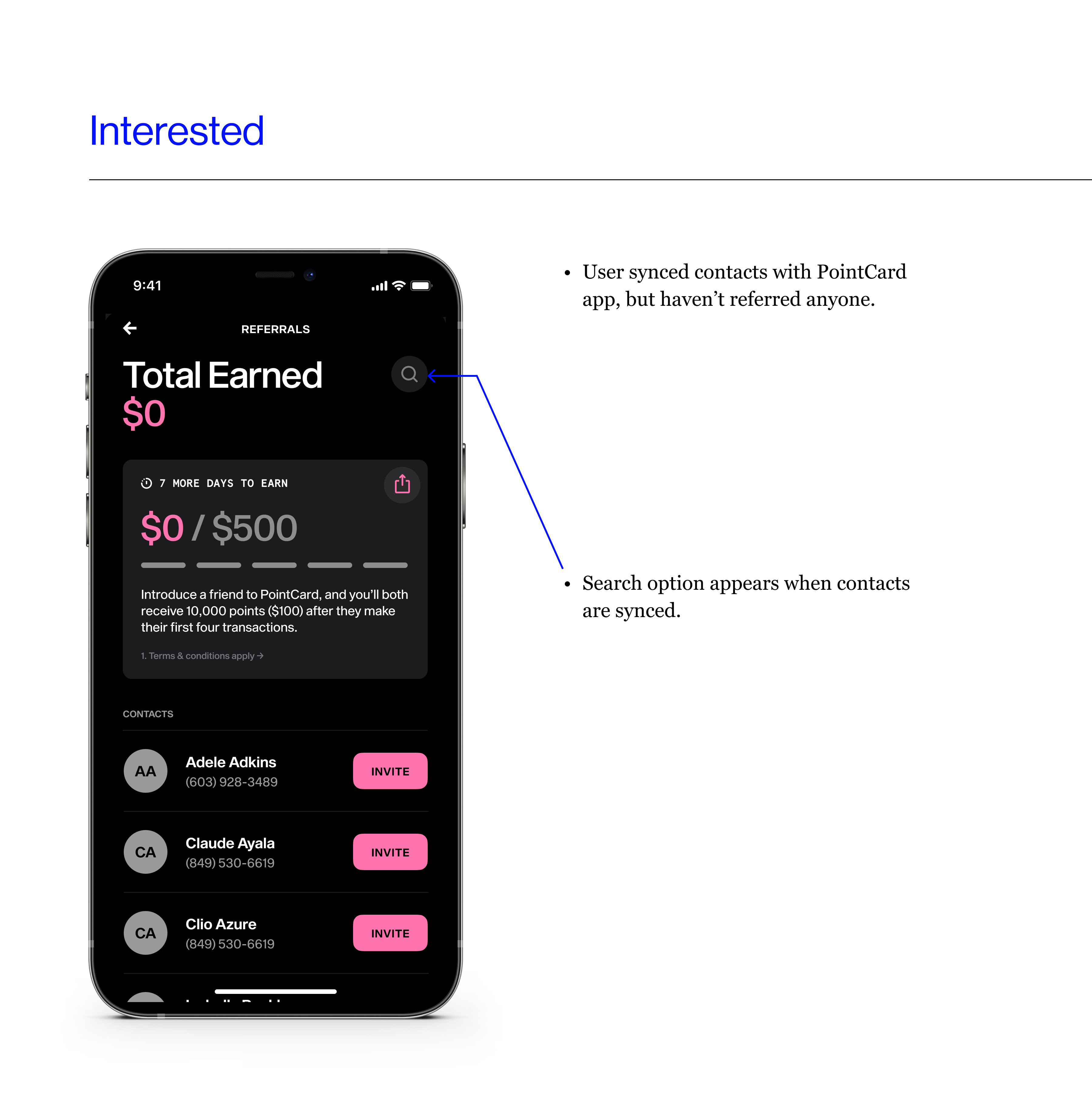 I partitioned the screen estate into four distinct sections, each serving a specific purpose in this flow. The primary and fundamental data displayed is the cardholder's earnings achieved through referrals to friends. Following that, the second most significant aspect is the progress of the current campaign. The main Call-to-Action (CTA) options are as follows: "Sync Contacts" for users who haven't yet synced their contacts, "Send" for those without outstanding referrals, and "Remind" for those awaiting their contacts to complete the referral campaign.